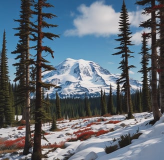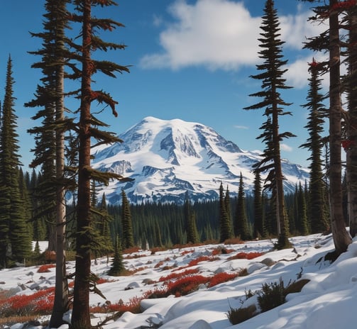 Explore America's breathtaking landscapes and natural wonders. Below on top left are the Redwoods of National Park. On the top right we have Mount Rainier. On the bottom left is Antelope Valley. On the bottom right we have Mount Sneffels, Colorado.